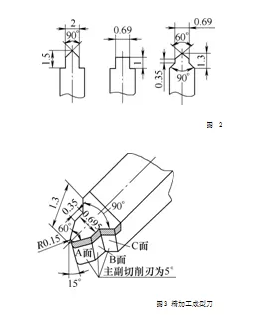廣東機械加工廠解決方案:降低主軸轉速及徑向進給率,對刀具刃磨時進行刃口修光,程序運行時在槽底停留時間延長1s。吸取了前面失敗教訓,再次加工時設定主軸轉速80 r/min徑向進給率0.07 mm/min,3把刀具在充足的冷卻液中,循環切槽程序終于在5h后完美加工好槽型,用線切割檢驗樣板進行燈光縫隙檢驗,加工后零件獲得優異的表面質量,能夠滿足圖樣尺寸及公差要求。加工工藝參數見附表。表格中所用刀具均是株洲鉆石YT05硬質合金焊接刀具。